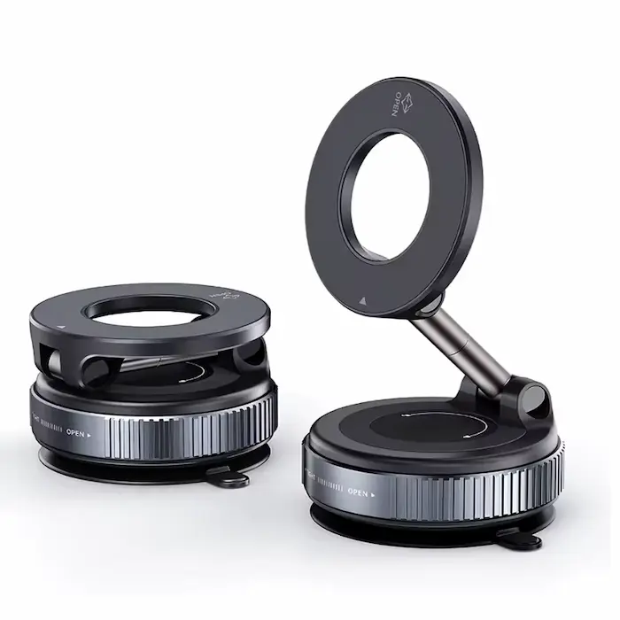Ventosa com suporte magnético para celulares. Gruda em qualquer superfície lisa.
